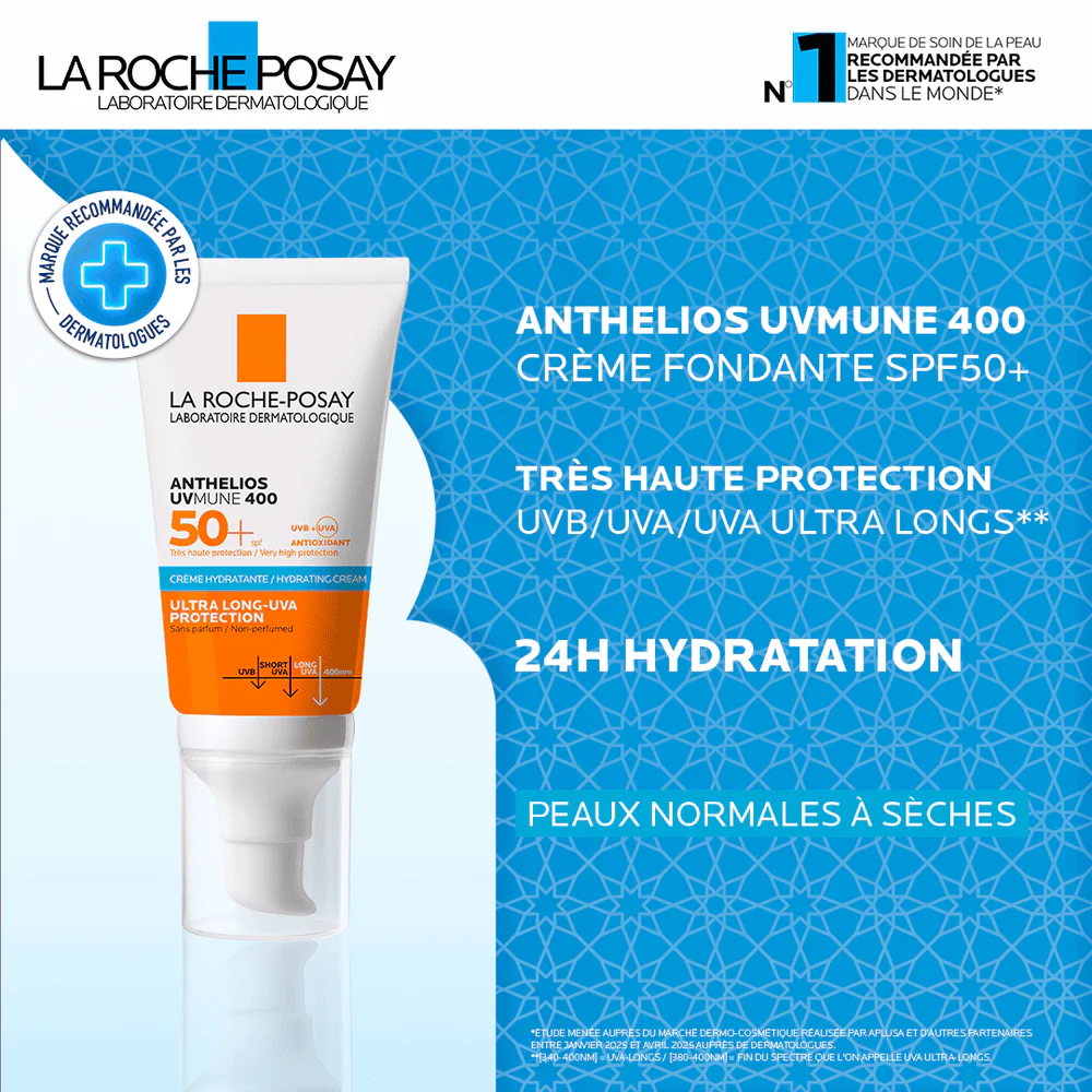 Anthelios UVMune 400 SPF 50+ écran solaire, offre une très haute protection du visage contre les UVA et UVB pour les peaux sensibles, notamment celles souffrant d’allergies solaires.
