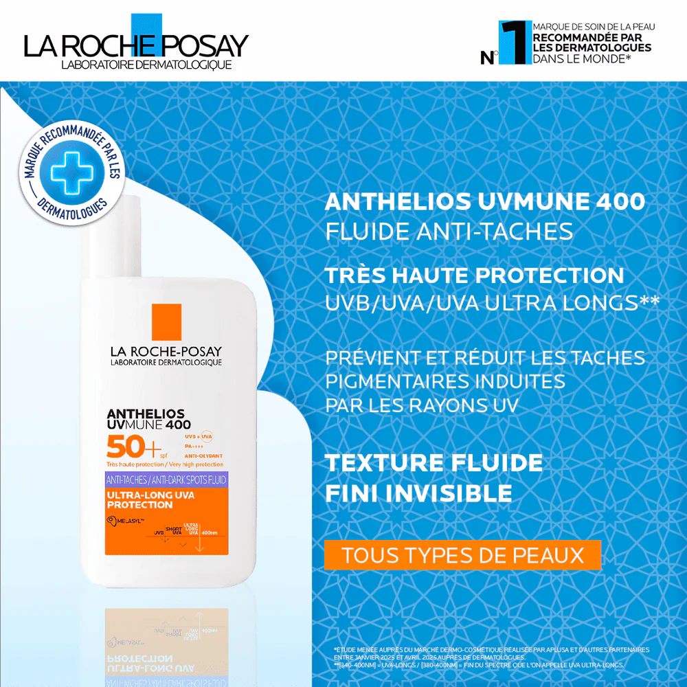 Le fluide solaire Anthelios UVmune 400 SPF 50+ de La Roche-Posay offre une protection haute performance contre les rayons UVA/UVB et la formation de taches pigmentaires. Spécialement conçu pour les peaux sensibles, il est sans parfum, hypoallergénique et testé dermatologiquement.
